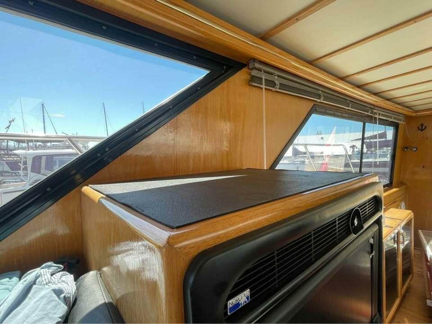 Main Salon: Enter through a large sliding glass door into a bright and inviting space filled with natural light from long port and starboard windows. The comfortable L-shaped settee includes storage underneath and converts to a hide-away bed, perfect for entertaining or accommodating guests. Electric heat ensures comfort in any season.