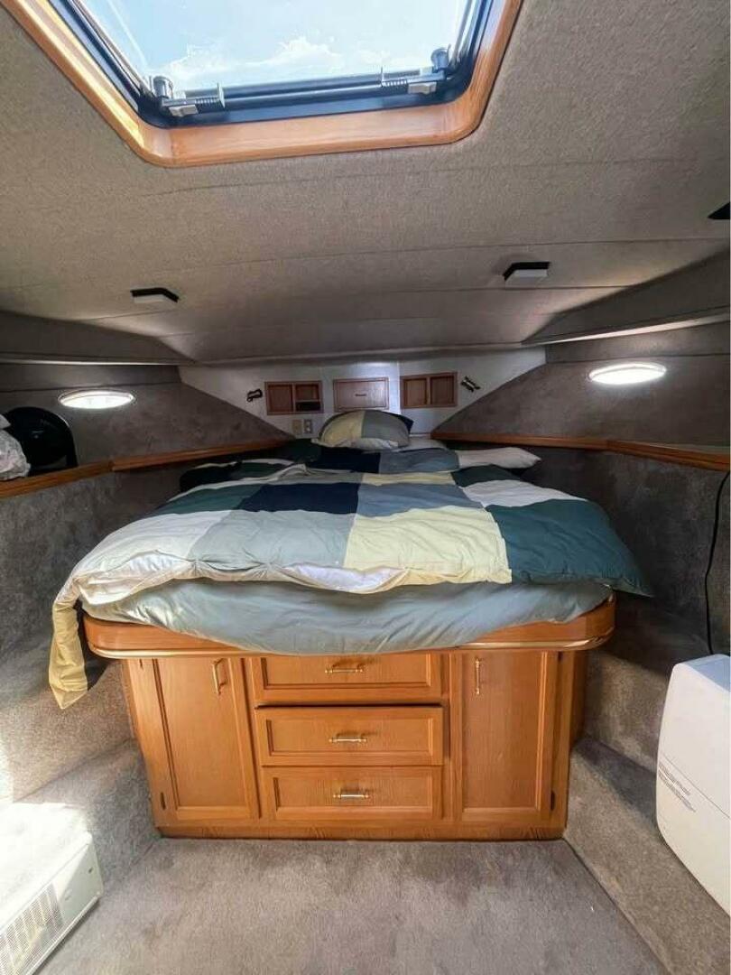 Flybridge: A truly outstanding feature of this yacht, the flybridge offers excellent visibility, abundant space for storage or lounging, and a recently refreshed seating area. The helm features a pivoting captain’s chair, while guest seating for four converts into sun loungers. A Sony sound system, cup holders, and a hinged radar arch complete this perfect social hub.